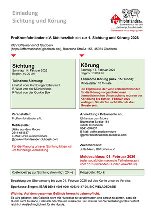 Herzliche Einladung zur ersten Sichtung und Körung im Jahr 2026, sie findet wie im letzten Jahr in Gladbeck statt.